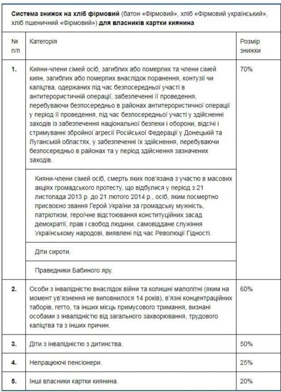 В начале марта 2019 года "Киевхлеб" будет продавать "социальные сорта" хлеба по "Карточке киевлянина". Размеры скидки будут зависеть от льготной категории, указанной в карточке.