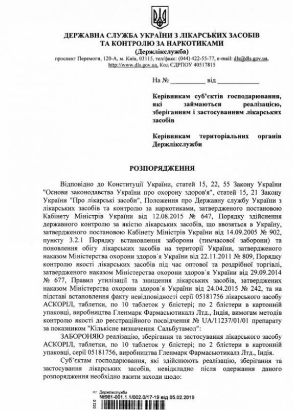 Речь идет о Аскоріл таблетки по 10 таблеток в блистере серии 05181756. Производителем лекарства является Гленмарк Фармасьютикалз Лтд., Индия, сообщает Государственная служба Украины по лекарственным средствам и контролю за наркотиками.