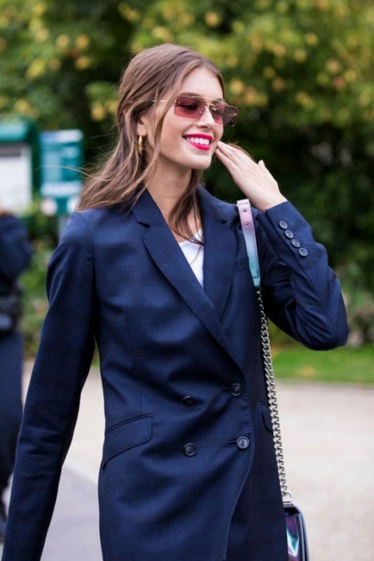Для прогулки Кайя выбрала строгий и яркий образ: большой костюм-двойку темно-синего цвета и белую футболку.