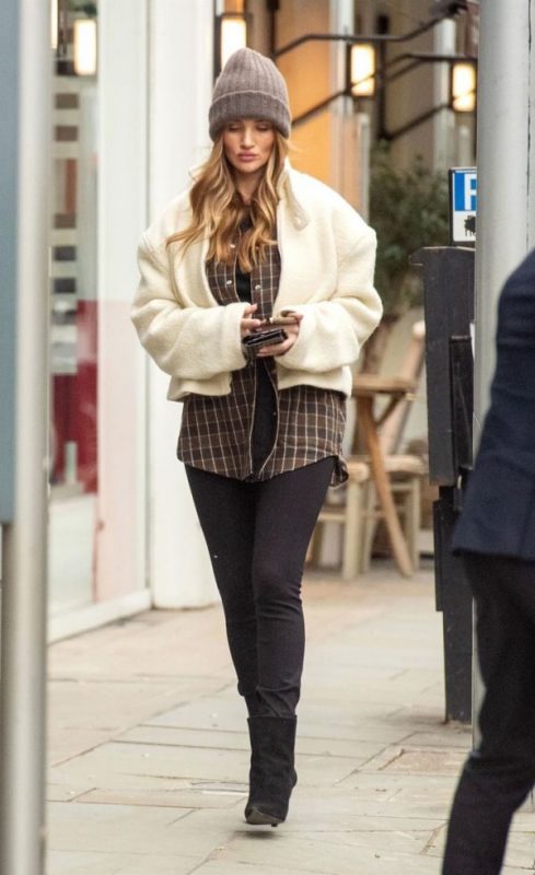 Для своєї прогулянки містом Роузі обрала найкомфортніші і, при цьому, модні речі, в яких вона виглядала дуже органічно. Молода мама одягла чорні джинси, а зверху накинула оверсайз сорочку в клітку та білу куртку із флісу. Образ доповнила шапка-біні — найстильніший і найзручніший аксесуар.