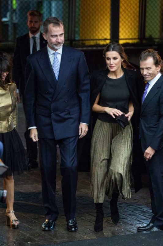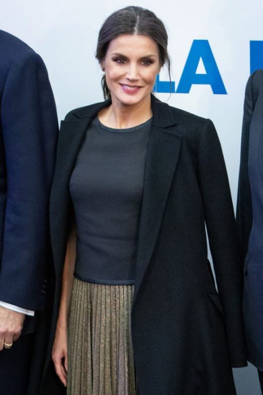 Так, накануне Летиция Ортис приняла участие в официальном мероприятии - 20-летие газеты La Razon. Для своего выхода Летиция выбрала юбку-плиссе с золотистым люрексом Zara - достаточно демократичный выбор!, добавив к образу темный топ, пальто Felipe Varela и сапожки Magrit.